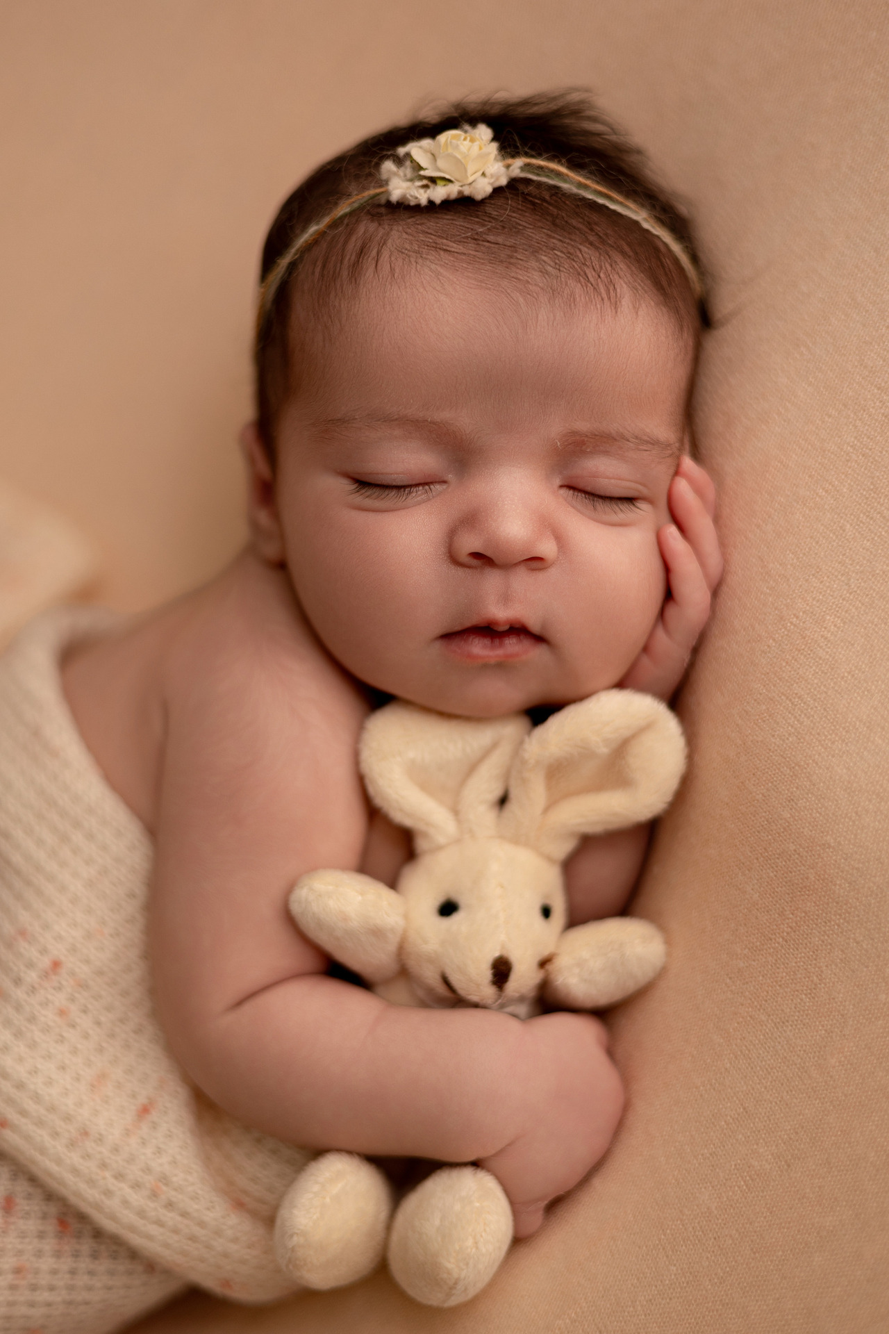 Malena, enrolada em um wrap macio, foi a sensação do ensaio. Evitamos poses rebuscadas e priorizamos seus movimentos naturais — um bocejo, um suspiro, as mãozinhas segurando o ursinho de pelúcia. Cada clique registrou a tranquilidade do momento, sem pressa ou interferências.
